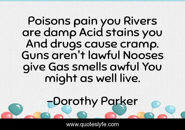 This page presents the quote "Poisons pain you Rivers are damp Acid stains you And drugs cause cramp. Guns aren't lawful Nooses give Gas smells awful You might as well live.". Author of this quote is Dorothy Parker. This quote is about death, dying,.