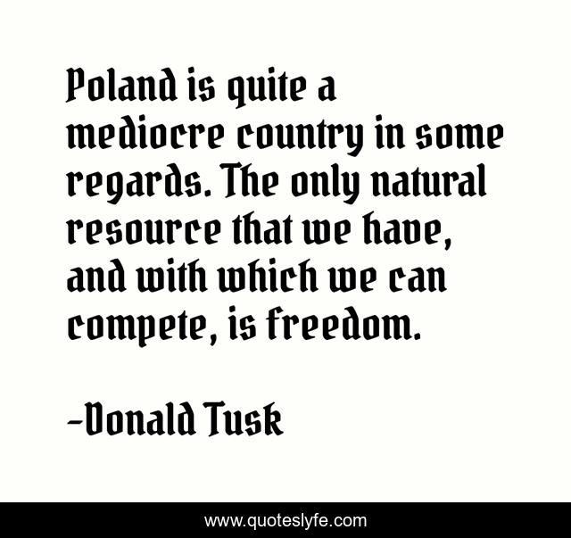 This page presents the quote "Poland is quite a mediocre country in some regards. The only natural resource that we have, and with which we can compete, is freedom.". Author of this quote is Donald Tusk. This quote is about country, compete, natural,.