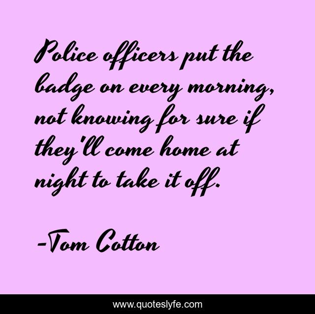 This page presents the quote "Police officers put the badge on every morning, not knowing for sure if they'll come home at night to take it off.". Author of this quote is Tom Cotton. This quote is about home, police, night,.