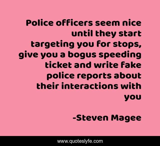 This page presents the quote "Police officers seem nice until they start targeting you for stops, give you a bogus speeding ticket and write fake police reports about their interactions with you". Author of this quote is Steven Magee. This quote is about police, fake, seem, targeting, police-state, stops, write, start, police-procedural,.