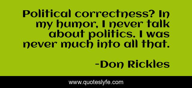 This page presents the quote "Political correctness? In my humor, I never talk about politics. I was never much into all that.". Author of this quote is Don Rickles. This quote is about politics, political, talk,.