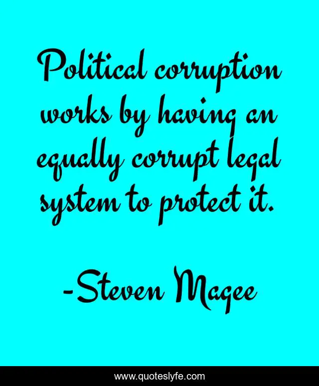This page presents the quote "Political corruption works by having an equally corrupt legal system to protect it.". Author of this quote is Steven Magee. This quote is about equally, protective, politician, legal-system, protect, corruption-politics, political, system, legal,.