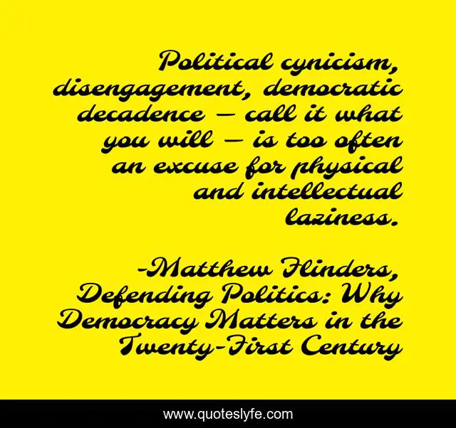 This page presents the quote "Political cynicism, disengagement, democratic decadence — call it what you will — is too often an excuse for physical and intellectual laziness.". Author of this quote is Matthew Flinders, Defending Politics: Why Democracy Matters in the Twenty-First Century. .
