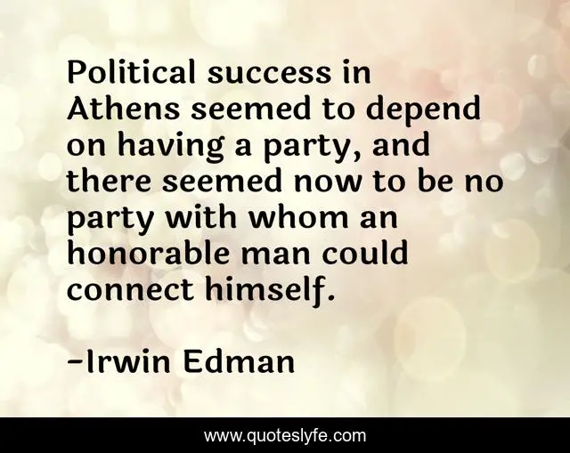 This page presents the quote "Political success in Athens seemed to depend on having a party, and there seemed now to be no party with whom an honorable man could connect himself.". Author of this quote is Irwin Edman. .
