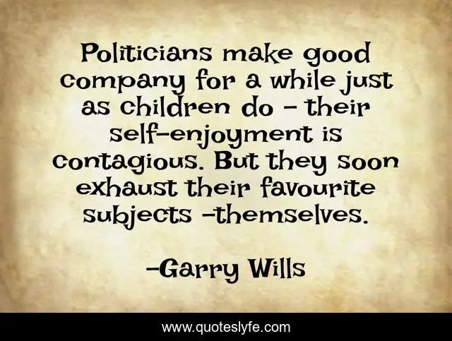 This page presents the quote "Politicians make good company for a while just as children do - their self-enjoyment is contagious. But they soon exhaust their favourite subjects -themselves.". Author of this quote is Garry Wills. .