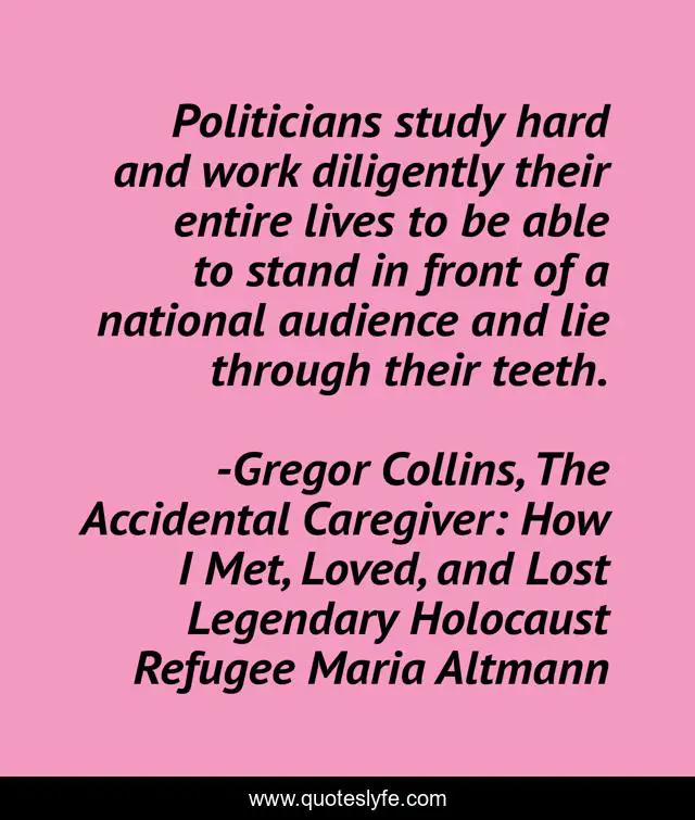 This page presents the quote "Politicians study hard and work diligently their entire lives to be able to stand in front of a national audience and lie through their teeth.". Author of this quote is Gregor Collins, The Accidental Caregiver: How I Met, Loved, and Lost Legendary Holocaust Refugee Maria Altmann. .