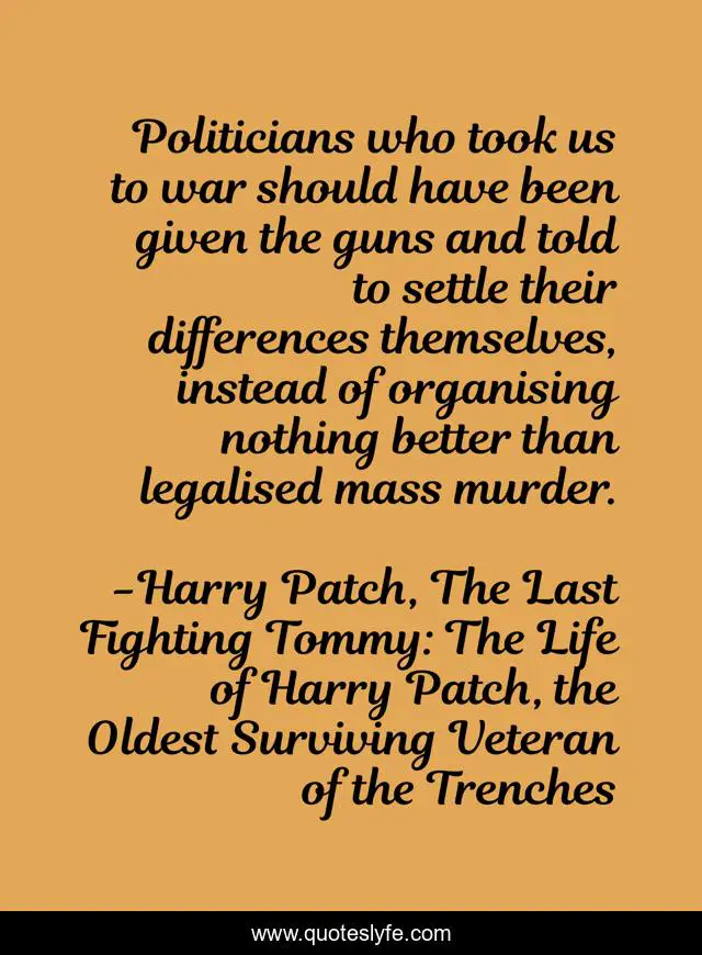 This page presents the quote "Politicians who took us to war should have been given the guns and told to settle their differences themselves, instead of organising nothing better than legalised mass murder.". Author of this quote is Harry Patch, The Last Fighting Tommy: The Life of Harry Patch, the Oldest Surviving Veteran of the Trenches. This quote is about politicians, peace, war, words-of-wisdom, legalised-mass-murder,.