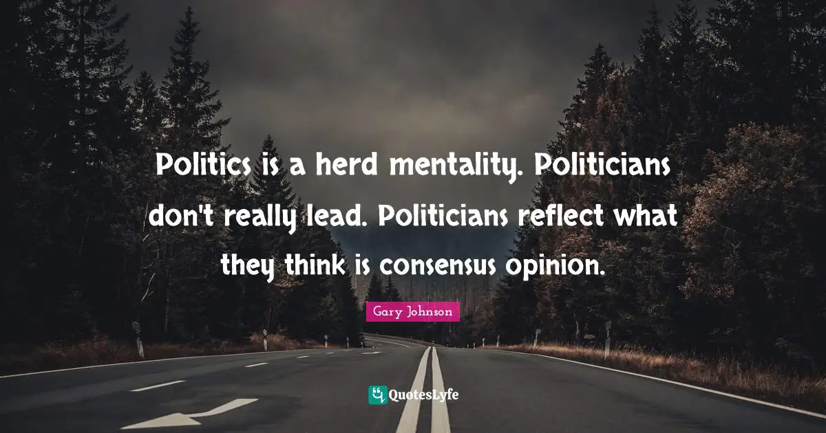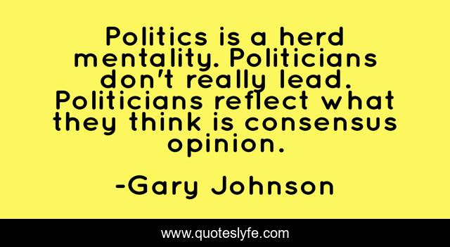 This page presents the quote "Politics is a herd mentality. Politicians don't really lead. Politicians reflect what they think is consensus opinion.". Author of this quote is Gary Johnson. This quote is about opinion, think, lead,.