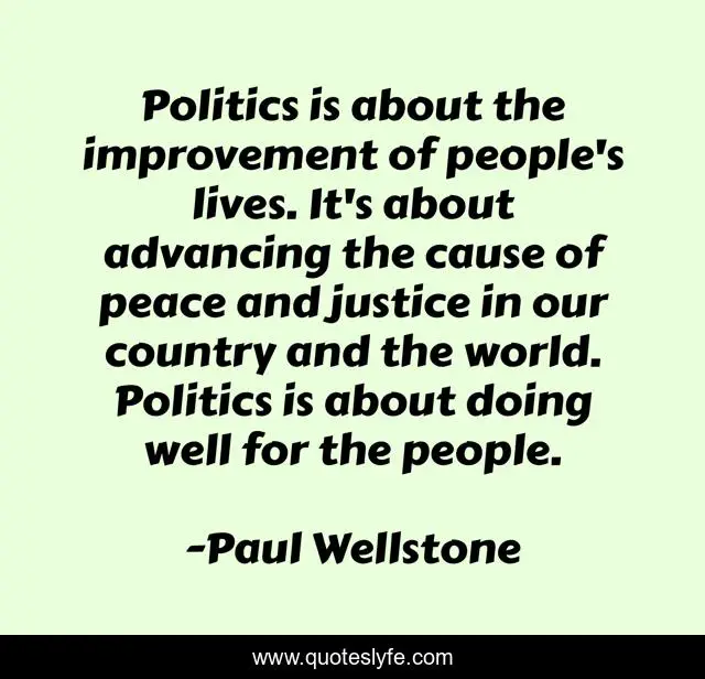 This page presents the quote "Politics is about the improvement of people's lives. It's about advancing the cause of peace and justice in our country and the world. Politics is about doing well for the people.". Author of this quote is Paul Wellstone. This quote is about justice, peace, improvement,.
