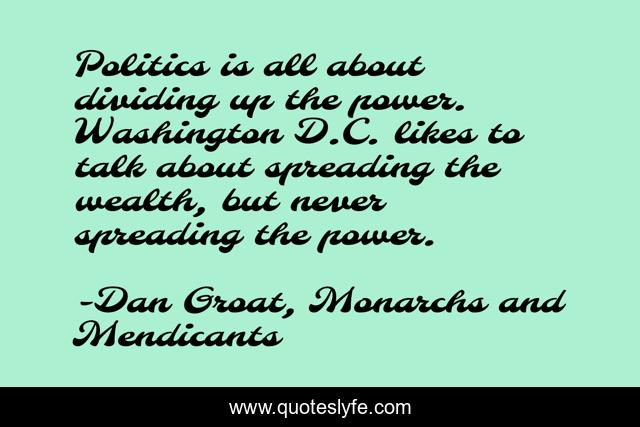 This page presents the quote "Politics is all about dividing up the power. Washington D.C. likes to talk about spreading the wealth, but never spreading the power.". Author of this quote is Dan Groat, Monarchs and Mendicants. This quote is about politics, spreading-the-wealth, power, wealth,.