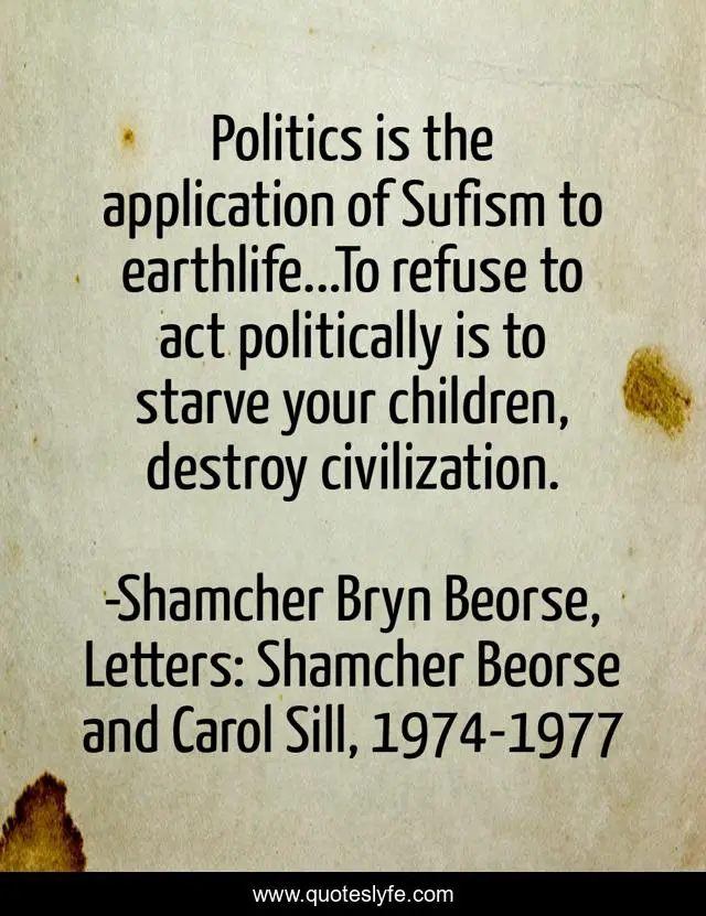 This page presents the quote "Politics is the application of Sufism to earthlife...To refuse to act politically is to starve your children, destroy civilization.". Author of this quote is Shamcher Bryn Beorse, Letters: Shamcher Beorse and Carol Sill, 1974-1977. This quote is about politics, sufism,.