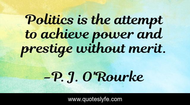 This page presents the quote "Politics is the attempt to achieve power and prestige without merit.". Author of this quote is P. J. O'Rourke. This quote is about without, power, achieve,.
