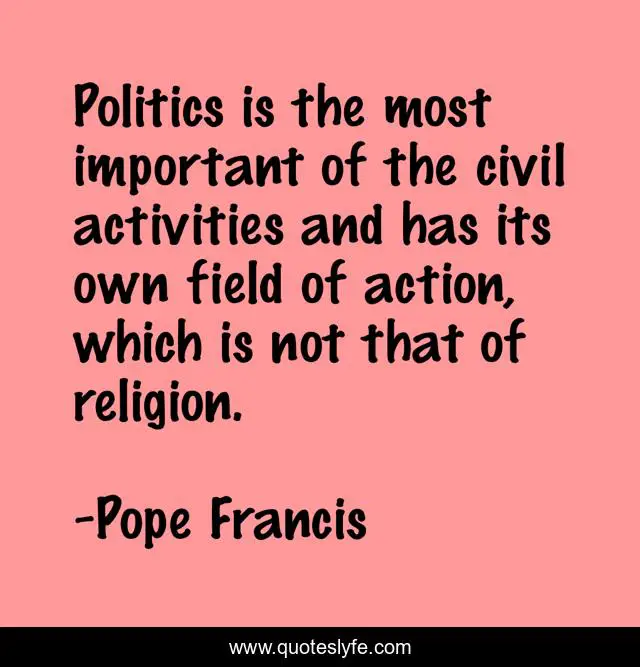 This page presents the quote "Politics is the most important of the civil activities and has its own field of action, which is not that of religion.". Author of this quote is Pope Francis. This quote is about action, politics, important,.