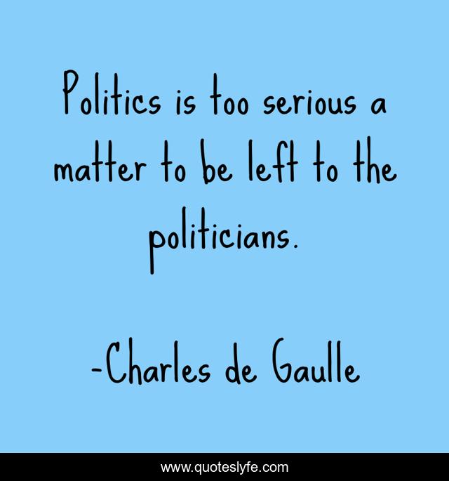 This page presents the quote "Politics is too serious a matter to be left to the politicians.". Author of this quote is Charles de Gaulle. This quote is about gaulle, politics, de, political, charles,.