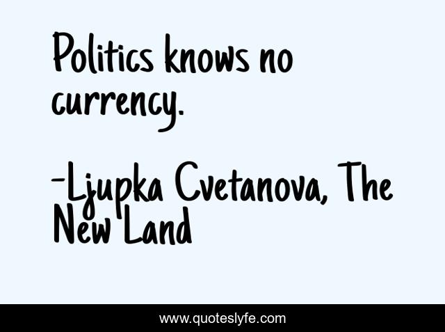 "Ljupka Cvetanova, The New Land Quotes." Quoteslyfe.com, 2025. Mon. 08 Dec. 2025. <https://www.quoteslyfe.com/quote/Politics-knows-no-currency-80414>.