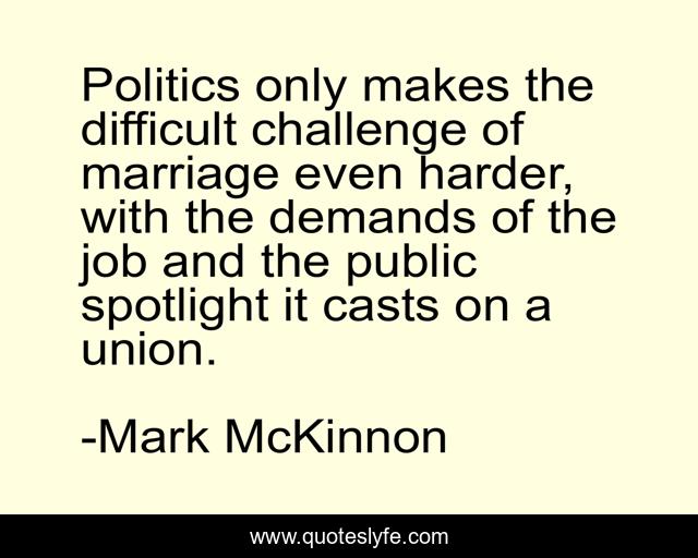 This page presents the quote "Politics only makes the difficult challenge of marriage even harder, with the demands of the job and the public spotlight it casts on a union.". Author of this quote is Mark McKinnon. This quote is about politics, challenge, job,.