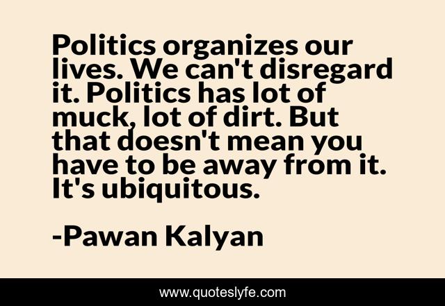 This page presents the quote "Politics organizes our lives. We can't disregard it. Politics has lot of muck, lot of dirt. But that doesn't mean you have to be away from it. It's ubiquitous.". Author of this quote is Pawan Kalyan. This quote is about mean, dirt,.