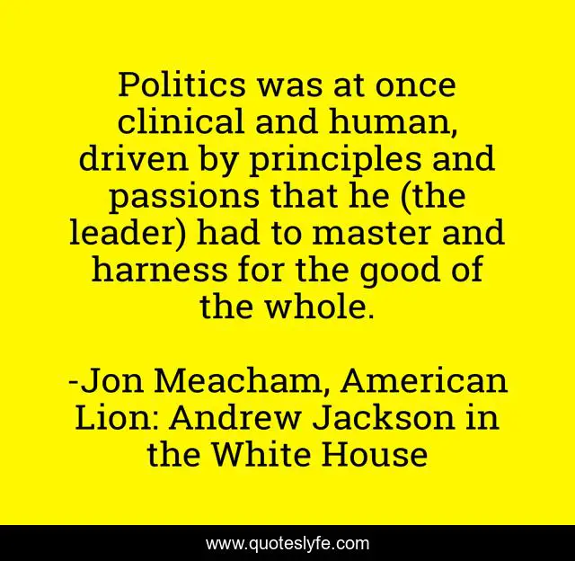 This page presents the quote "Politics was at once clinical and human, driven by principles and passions that he (the leader) had to master and harness for the good of the whole.". Author of this quote is Jon Meacham, American Lion: Andrew Jackson in the White House. This quote is about leadership, emotions, strategy,.