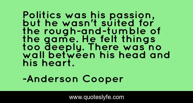 This page presents the quote "Politics was his passion, but he wasn't suited for the rough-and-tumble of the game. He felt things too deeply. There was no wall between his head and his heart.". Author of this quote is Anderson Cooper. This quote is about politics, sadness, despair,.