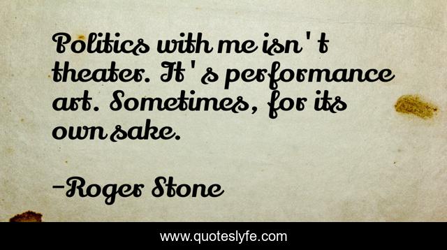This page presents the quote "Politics with me isn't theater. It's performance art. Sometimes, for its own sake.". Author of this quote is Roger Stone. This quote is about me, performance, art,.