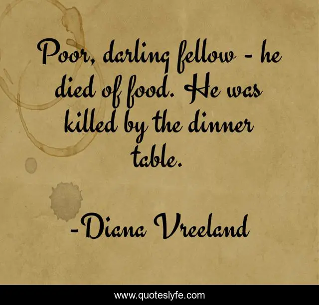 This page presents the quote "Poor, darling fellow - he died of food. He was killed by the dinner table.". Author of this quote is Diana Vreeland. This quote is about poor, dinner, dinner table,.