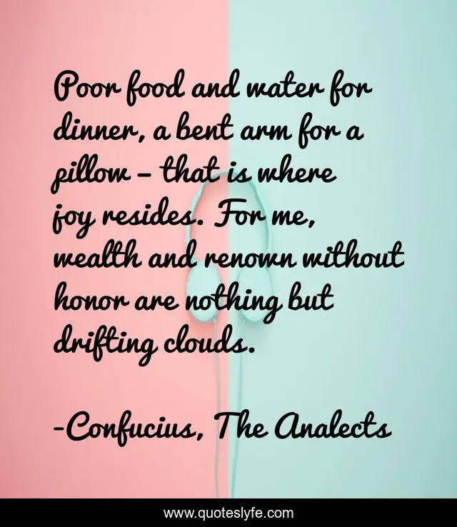 This page presents the quote "Poor food and water for dinner, a bent arm for a pillow – that is where joy resides. For me, wealth and renown without honor are nothing but drifting clouds.". Author of this quote is Confucius, The Analects. .