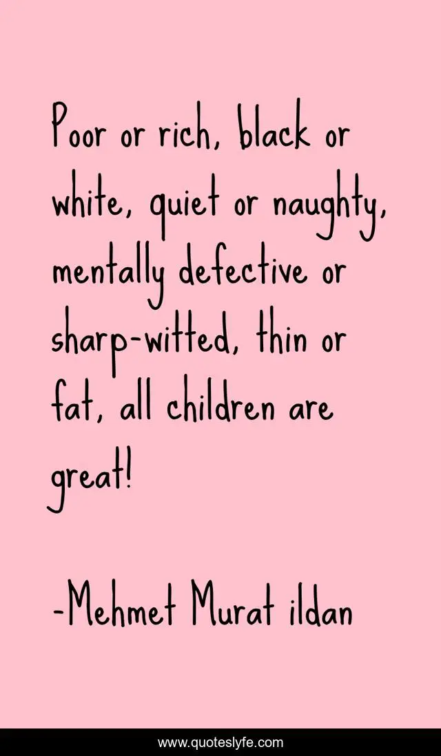 This page presents the quote "Poor or rich, black or white, quiet or naughty, mentally defective or sharp-witted, thin or fat, all children are great!". Author of this quote is Mehmet Murat ildan. .