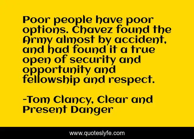 This page presents the quote "Poor people have poor options. Chavez found the Army almost by accident, and had found it a true open of security and opportunity and fellowship and respect.". Author of this quote is Tom Clancy, Clear and Present Danger. This quote is about military, education, poverty, class,.