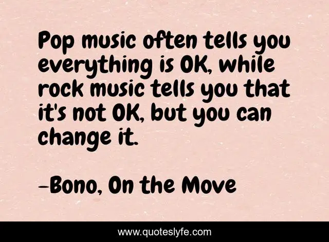This page presents the quote "Pop music often tells you everything is OK, while rock music tells you that it's not OK, but you can change it.". Author of this quote is Bono, On the Move. .