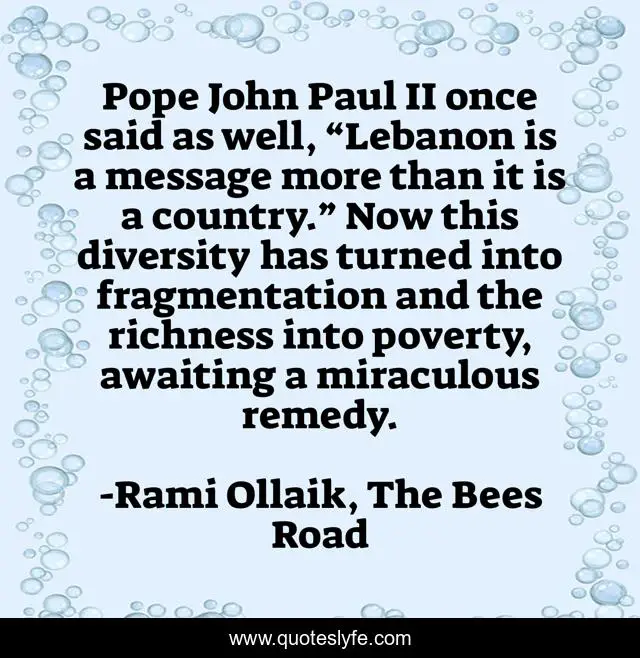 This page presents the quote "Pope John Paul II once said as well, “Lebanon is a message more than it is a country.” Now this diversity has turned into fragmentation and the richness into poverty, awaiting a miraculous remedy.". Author of this quote is Rami Ollaik, The Bees Road. This quote is about fragmentation, diversity, richness, country, lebanon, john-paul-ii, remedy, poverty, message,.