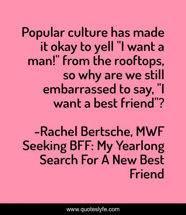 This page presents the quote "Popular culture has made it okay to yell "I want a man!" from the rooftops, so why are we still embarrassed to say, "I want a best friend"?". Author of this quote is Rachel Bertsche, MWF Seeking BFF: My Yearlong Search For A New Best Friend. This quote is about best-friend, friend,.