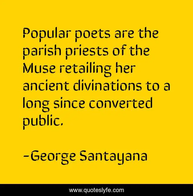 This page presents the quote "Popular poets are the parish priests of the Muse retailing her ancient divinations to a long since converted public.". Author of this quote is George Santayana. This quote is about poets, poetry,.