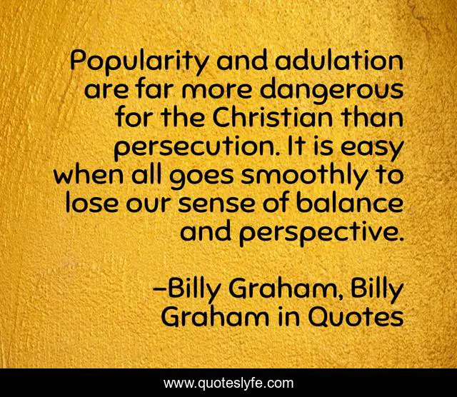 This page presents the quote "Popularity and adulation are far more dangerous for the Christian than persecution. It is easy when all goes smoothly to lose our sense of balance and perspective.". Author of this quote is Billy Graham, Billy Graham in Quotes. This quote is about christian-life, billy-graham,.