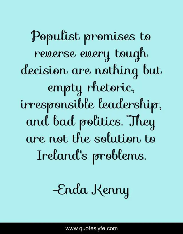 This page presents the quote "Populist promises to reverse every tough decision are nothing but empty rhetoric, irresponsible leadership, and bad politics. They are not the solution to Ireland's problems.". Author of this quote is Enda Kenny. This quote is about politics, decision, problems,.