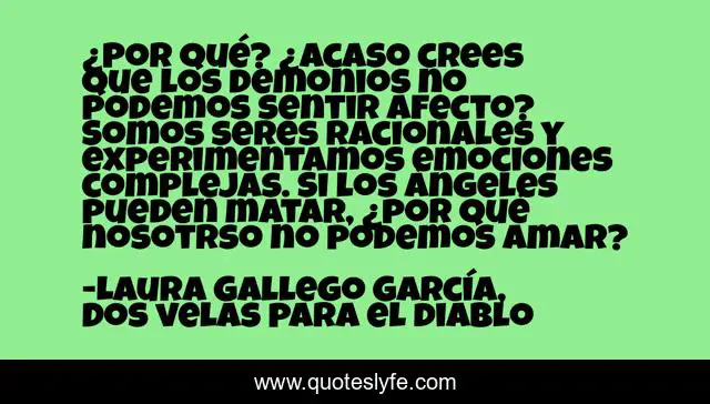 This page presents the quote "¿Por qué? ¿Acaso crees que los demonios no podemos sentir afecto? Somos seres racionales y experimentamos emociones complejas. Si los ángeles pueden matar, ¿por qué nosotrso no podemos amar?". Author of this quote is Laura Gallego García, Dos velas para el diablo. This quote is about emotion, demon, angel, truth,.