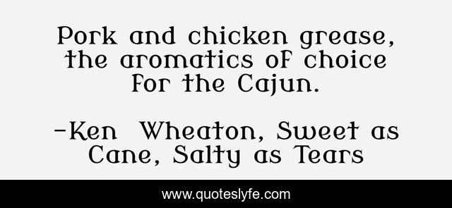 This page presents the quote "Pork and chicken grease, the aromatics of choice for the Cajun.". Author of this quote is Ken Wheaton, Sweet as Cane, Salty as Tears. This quote is about cajun, grease, cajun-style, food, cooking, pork, chicken,.