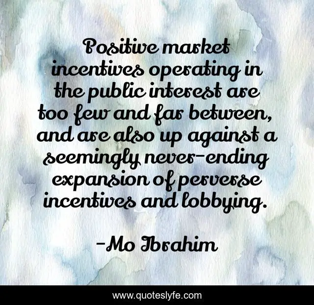 This page presents the quote "Positive market incentives operating in the public interest are too few and far between, and are also up against a seemingly never-ending expansion of perverse incentives and lobbying.". Author of this quote is Mo Ibrahim. This quote is about up, interest, between,.