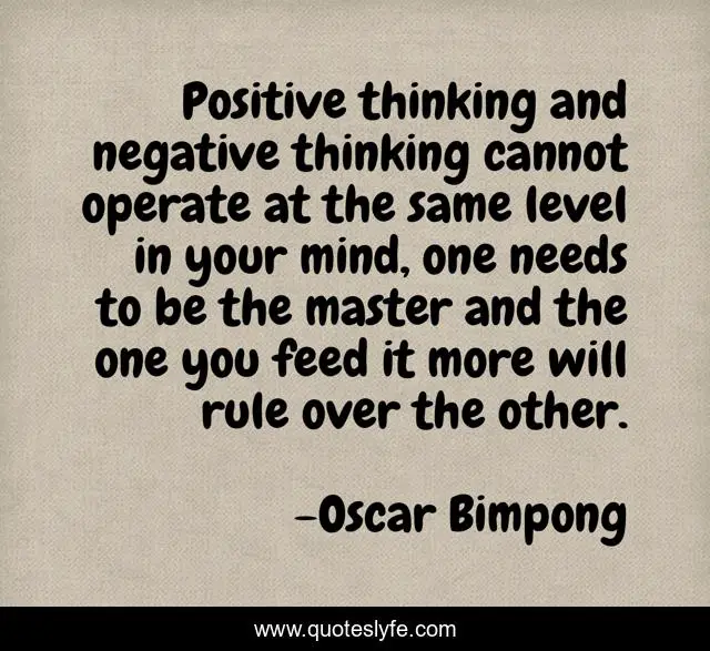 This page presents the quote "Positive thinking and negative thinking cannot operate at the same level in your mind, one needs to be the master and the one you feed it more will rule over the other.". Author of this quote is Oscar Bimpong. This quote is about feed-your-thoughts, negative-thinking, mind, positive-thinking, master,.