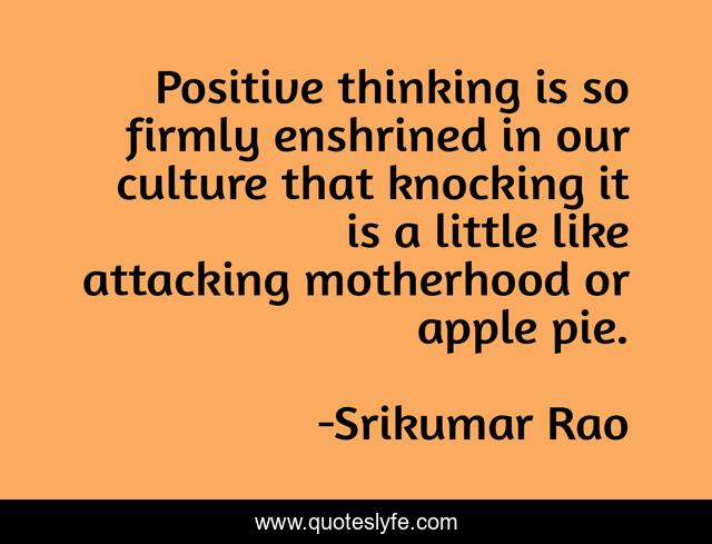 This page presents the quote "Positive thinking is so firmly enshrined in our culture that knocking it is a little like attacking motherhood or apple pie.". Author of this quote is Srikumar Rao. This quote is about culture, motherhood,.