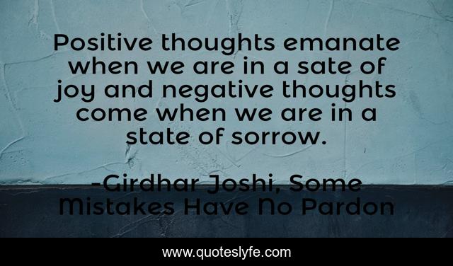 This page presents the quote "Positive thoughts emanate when we are in a sate of joy and negative thoughts come when we are in a state of sorrow.". Author of this quote is Girdhar Joshi, Some Mistakes Have No Pardon. This quote is about joy, sorrow, positive-thinking,.