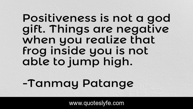 This page presents the quote "Positiveness is not a god gift. Things are negative when you realize that frog inside you is not able to jump high.". Author of this quote is Tanmay Patange. This quote is about humorous, positive-attitude, positivity, humor, positive-thinking,.