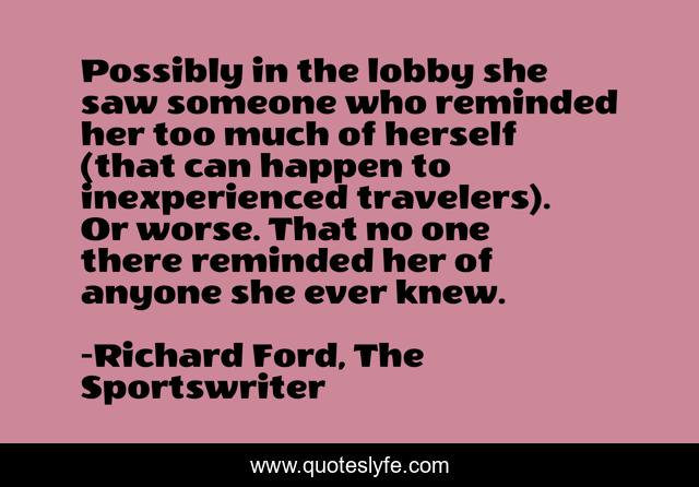 This page presents the quote "Possibly in the lobby she saw someone who reminded her too much of herself (that can happen to inexperienced travelers). Or worse. That no one there reminded her of anyone she ever knew.". Author of this quote is Richard Ford, The Sportswriter. This quote is about travel, recognition,.