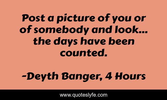 This page presents the quote "Post a picture of you or of somebody and look... the days have been counted.". Author of this quote is Deyth Banger, 4 Hours. This quote is about picture, curse, counted, dead,.