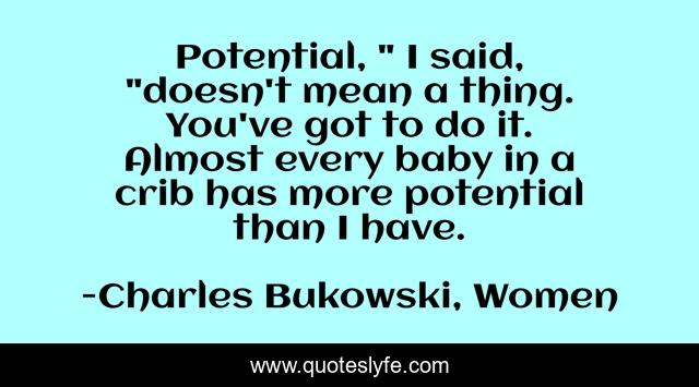 This page presents the quote "Potential, " I said, "doesn't mean a thing. You've got to do it. Almost every baby in a crib has more potential than I have.". Author of this quote is Charles Bukowski, Women. .