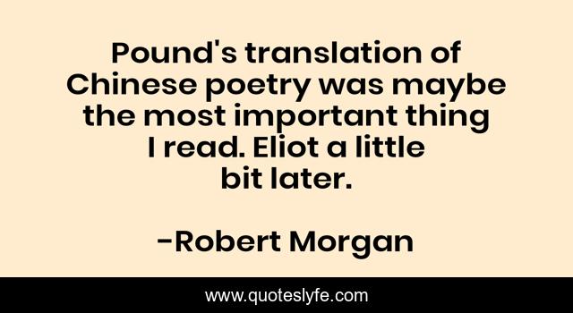 This page presents the quote "Pound's translation of Chinese poetry was maybe the most important thing I read. Eliot a little bit later.". Author of this quote is Robert Morgan. This quote is about the most important, little,.