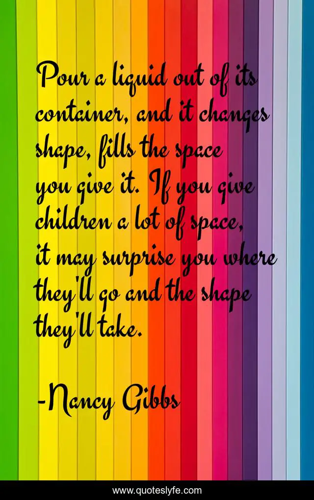 This page presents the quote "Pour a liquid out of its container, and it changes shape, fills the space you give it. If you give children a lot of space, it may surprise you where they'll go and the shape they'll take.". Author of this quote is Nancy Gibbs. This quote is about surprise, changes, children,.