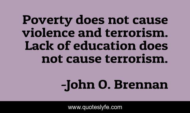 This page presents the quote "Poverty does not cause violence and terrorism. Lack of education does not cause terrorism.". Author of this quote is John O. Brennan. This quote is about terrorism, violence, poverty,.