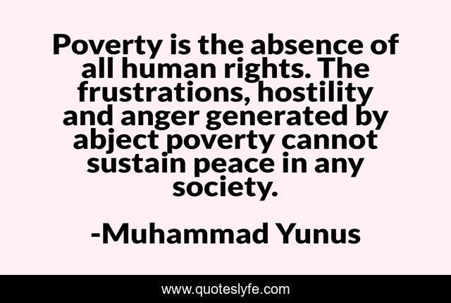 This page presents the quote "Poverty is the absence of all human rights. The frustrations, hostility and anger generated by abject poverty cannot sustain peace in any society.". Author of this quote is Muhammad Yunus. This quote is about anger, society, poverty,.