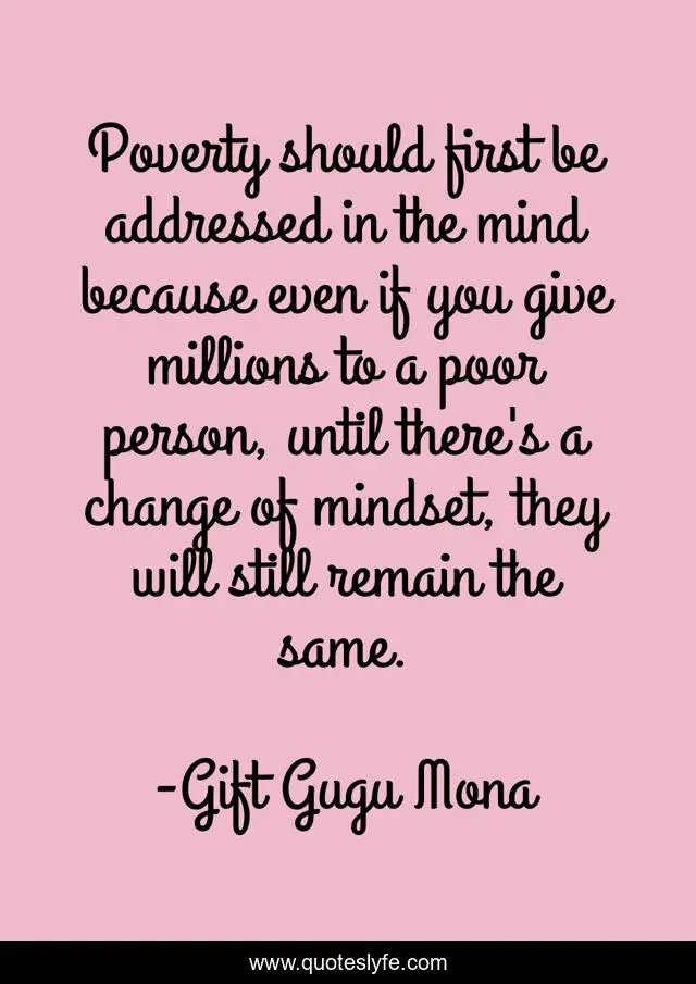 This page presents the quote "Poverty should first be addressed in the mind because even if you give millions to a poor person, until there's a change of mindset, they will still remain the same.". Author of this quote is Gift Gugu Mona. This quote is about poor-person, remain-the-same, mind, addressed, poverty, mind-set, change, millions,.