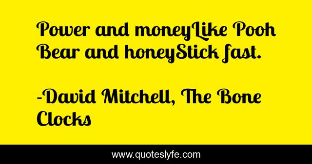 This page presents the quote "Power and moneyLike Pooh Bear and honeyStick fast.". Author of this quote is David Mitchell, The Bone Clocks. This quote is about money, power,.